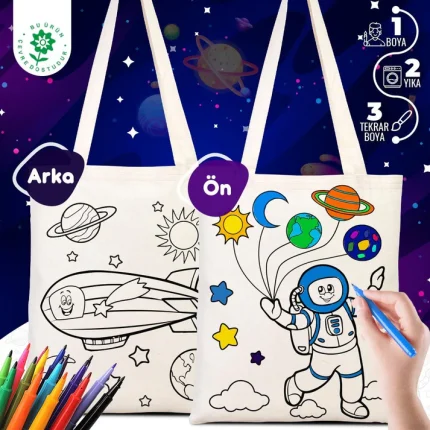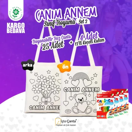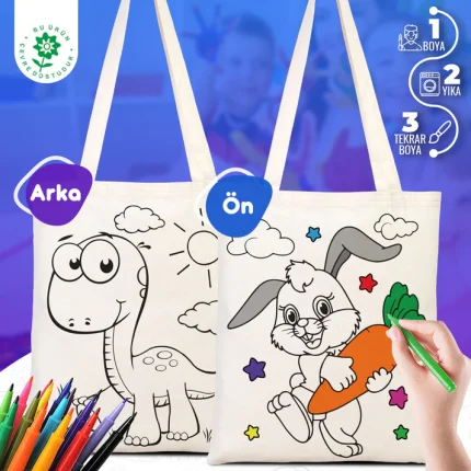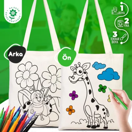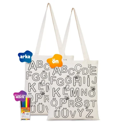 Kreş, anaokulu, ilkokul ve hobi atölyeleri için toplu olarak sipariş edilebilir. Dilerseniz boyama kalemleriyle set halinde alarak sınıf etkinliklerini tek adımda hazırlayabilirsiniz. Desenli boyanabilir bez çanta seçenekleri de mevcuttur ve istenilen ebatta üretim yapılabilir.