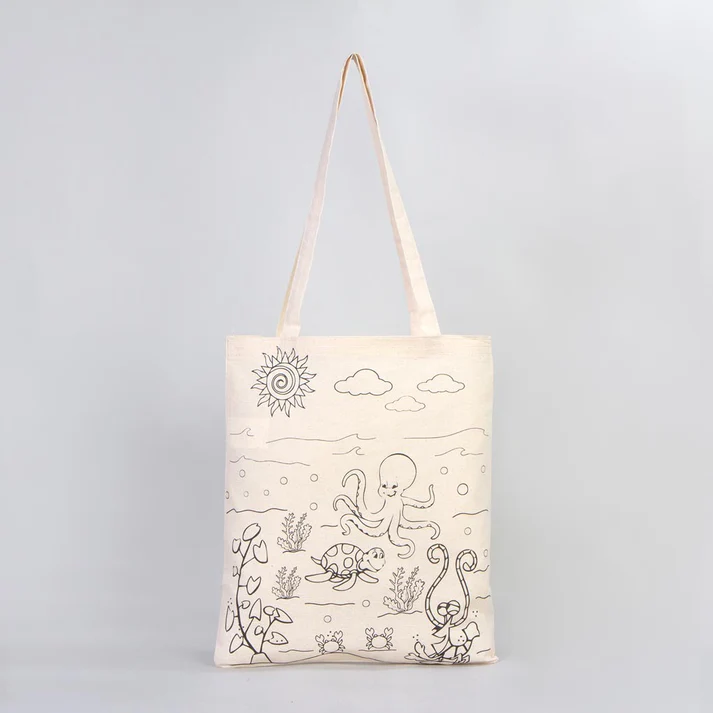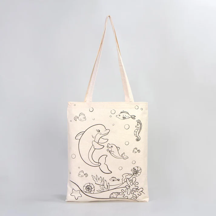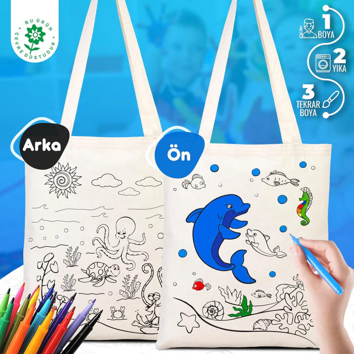 - Denizaltı Ve Yunus Çizimi Baskılı Boyamaya Uygun Bez Çanta