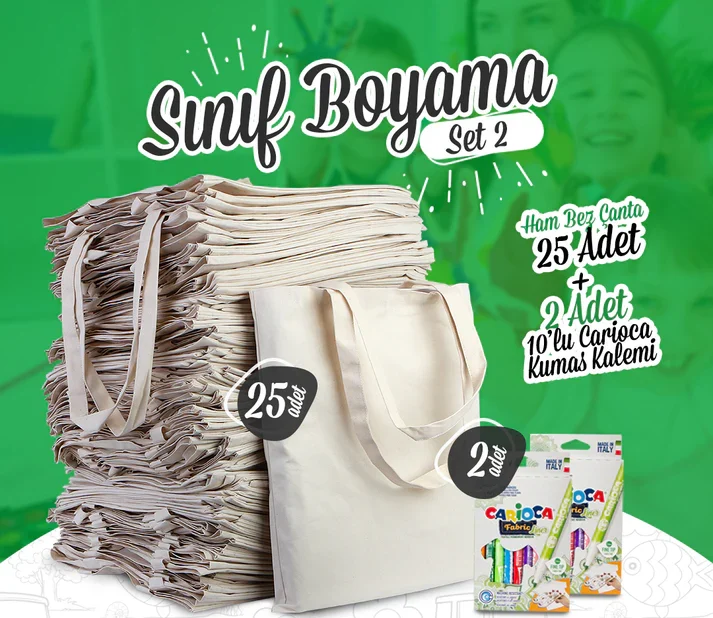 Sınıf Boyama Set 2 – 25 Adet Ham Bez Çanta / 2 Adet Carioca Kumaş Boya Kalemi