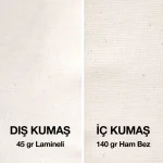 - İçi 140 gr ham bez kumaştan, dışı 45 gr yumuşak dokulu lamineli kumaştan imal edilmiş